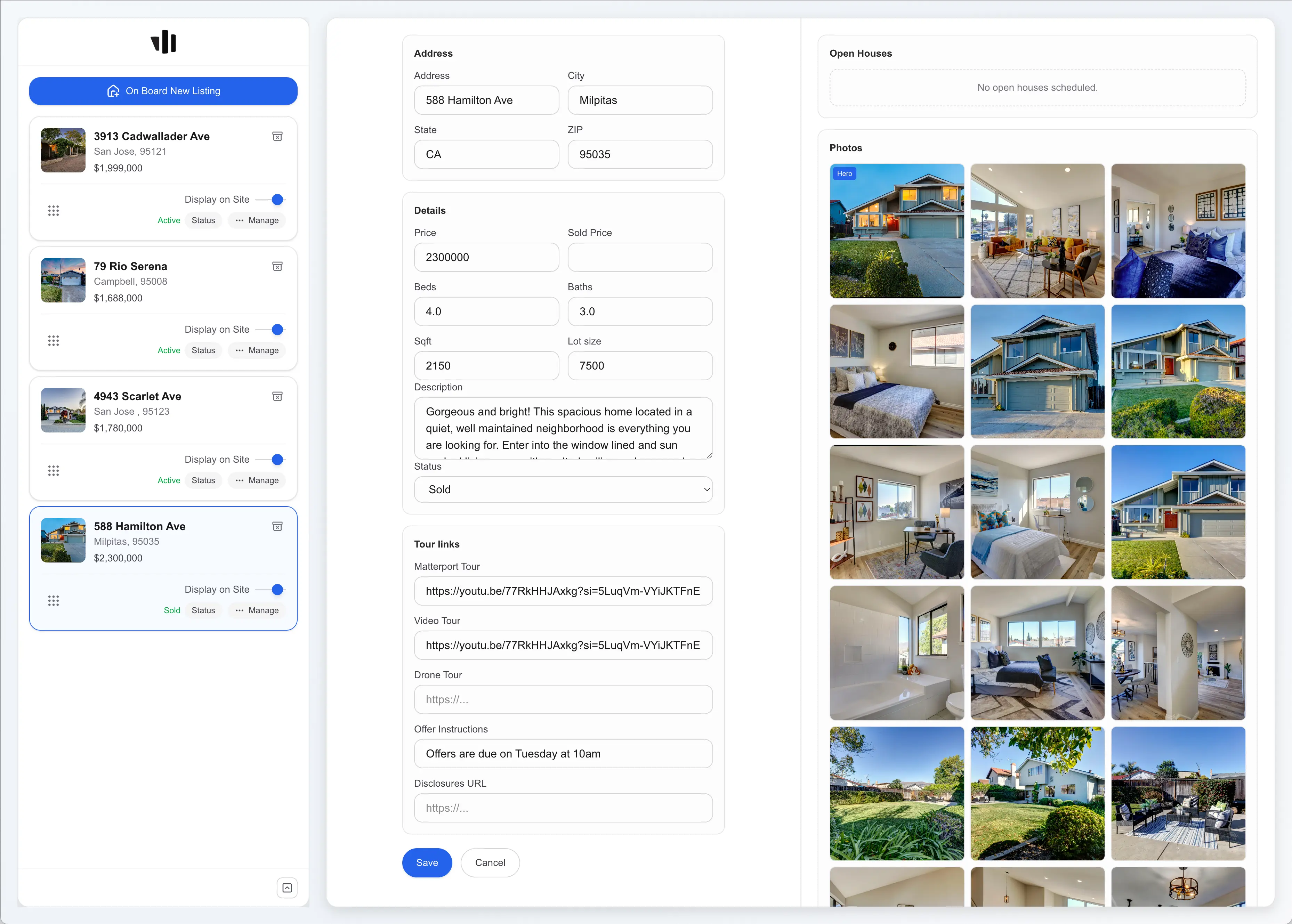 Manage listing info, photos, open houses, & sharable links/QR codes.
